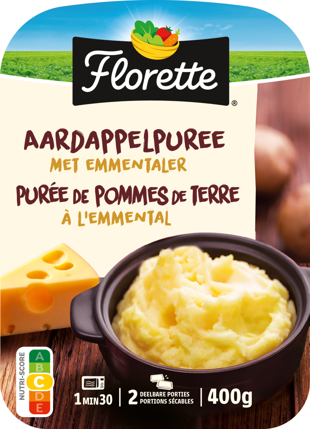 De Florette aardappelpuree met Emmentaler combineert een smeuïge textuur met de volle smaak van gesmolten kaas voor extra genot.