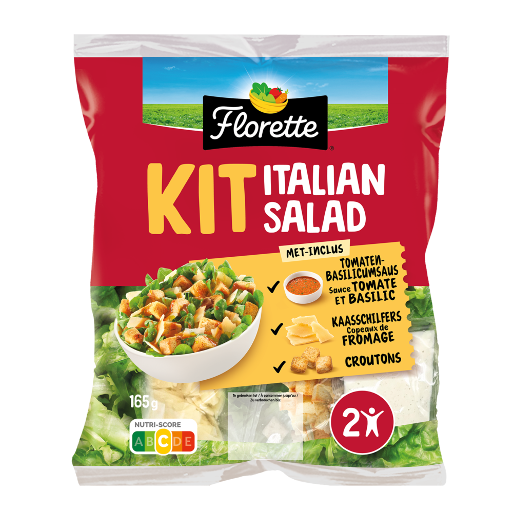 Le Kit Italian Salad Florette associe une salade fraîche à une sauce tomate-basilic savoureuse, des copeaux de fromage et des croûtons croustillants pour une salade gourmande aux accents italiens.